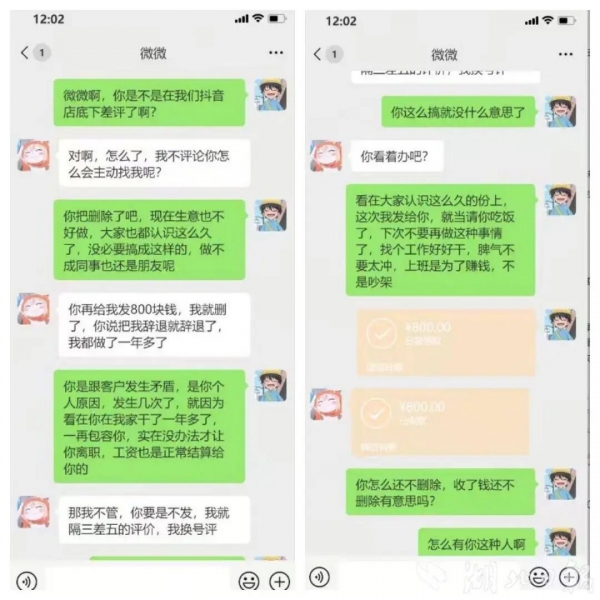 接单后,王某安排其小组成员上演了一场自导自演的"好戏":用两个微信账号,分别伪装成门店老板和离职员工,伪造了一整套"员工因离职矛盾,用施工瑕疵图恶意差评,要挟商家索要800元红包"的聊天记录,再配上伪造的离职证明,以"遭遇离职员工恶意报复和敲诈"为由,向平台发起申诉。最终,平台审核被这套完全伪造的材料蒙骗,将消费者发布的真实差评予以删除,该团伙也顺利拿到了删评服务费。