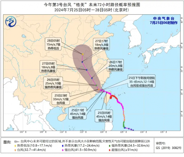 此外,今年第3号台风"格美"的中心已于今天(25日)00时前后在台湾省宜兰县南澳乡沿海登陆,登陆时由超强台风级减弱为强台风级,预计,"格美"将以每小时10-15公里的速度向西偏北方向移动,将于今天下午到夜间在福建秀屿到连江一带沿海登陆以后穿过福建后深入内陆,并逐渐转向偏北方向移动,强度逐渐减弱。