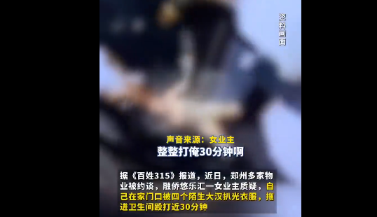 河南郑州,一名女子在自己家门口被四个大汉脱光衣服,并将其拖进厕所进行殴打,时间达30分钟。