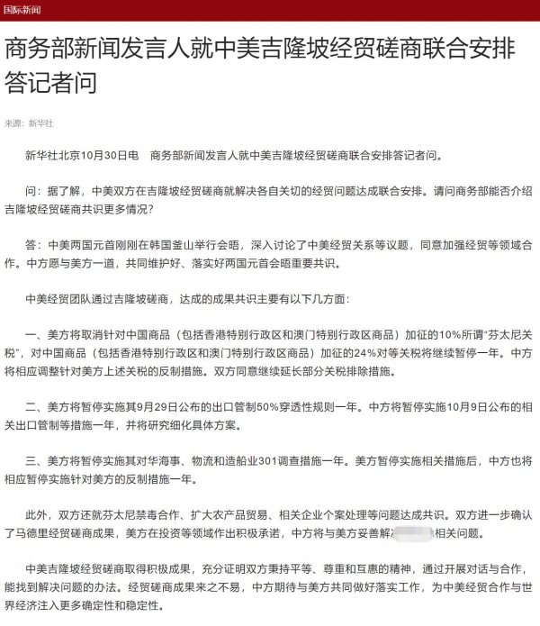 相对应的,中方也将调整对美反制措施,并首次证实将暂停实施稀土出口管制措施1年。
