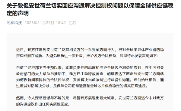 这样毫无执行力的"暂停"自然难以对"造反"了的安世荷兰方面有任何影响,截至11月23日,安世荷兰方面仍未对闻泰科技的沟通提议作出任何实质性回应。