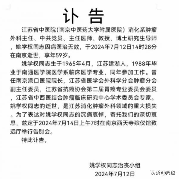 明天和意外不知道哪个先来!59岁的顶级肿瘤专家,江苏省中医院消化系肿瘤外科主任医师,博士生导师姚学权,于2024年7月12日14时28分在南泪目京突然离世,享年59岁。
