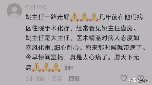 一位曾经的患者留言,几年前在病房住院经常看到姚主任查房。他医术很精湛,对病人态度如春风化雨,细心,耐心。却没想到那个时候姚主任已经带病了。今天早上惊闻噩耗,实在是太心痛了,愿天下无病。