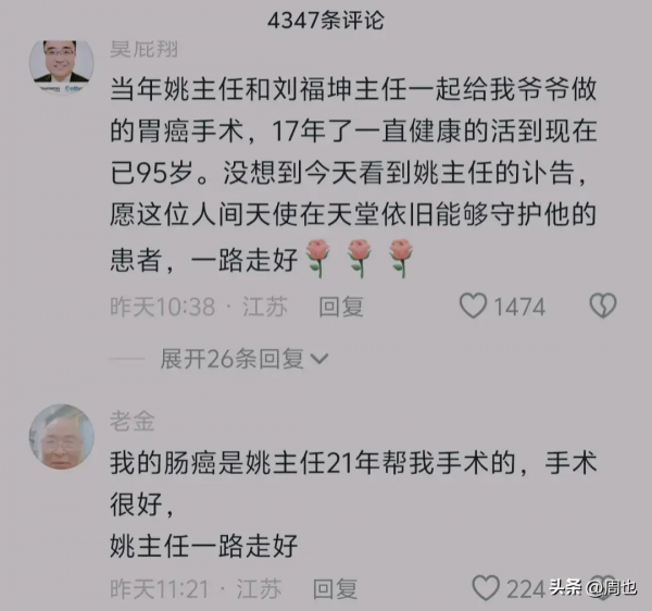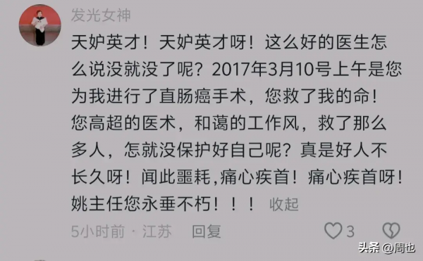 还有一位女士留言。在七年前,姚主任为她做了直肠癌手术,正因为姚主任高超的艺术,才救了她的命。 她说姚主任是一位很和蔼的医生,救了很多人,怎么就没救自己。她听闻姚主任离世的消息痛心疾首。