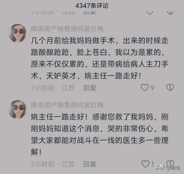 他她感谢姚主任救了她妈妈的命,她把姚主任离世的消息跟妈妈说,妈妈很伤心的哭了。天妒英才,愿姚主任走一路走好。希望大家对一线的医生多一些理解和体谅。