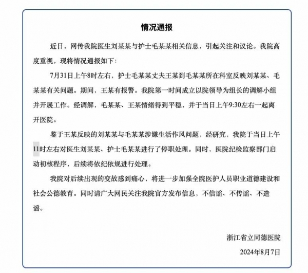 随着事件在网上传的沸沸扬扬,医院也是发出了通报回应,对刘某和毛某进行了停职处理。表示对后续出现的变故感到痛心,将进一步加强全院医护人员职业道德建设和社会公德教育。