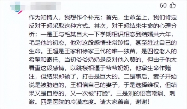 据知情人说王某是家里三代的唯一独苗,当初爷爷奶奶反对他入赘的,但由于他太重视这段感情,还以跳楼相逼。现在来看,他拿生命作赌注,最后输了,这无疑是崩溃的。