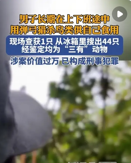 前几天在扬州高邮,一名男子被警察带走了,他从今年三月开始,每天上下班路上用弹弓打鸟,总共打了四十五只,警察在他宿舍的冰箱里找到四十四只已经处理过的鸟,当天还抓到他打的一只八哥,这些鸟不是普通野鸟,是国家保护的"三有"动物,也就是有益处、有经济价值、有科研价值的野生动物,每只鸟算下来值三百块钱,加起来有一万三千多块,超过了刑事案件立案的标准。