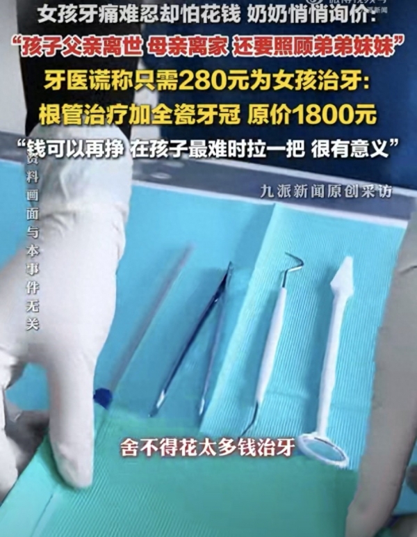 医生给她检查完发现,得做根管治疗加装全瓷牙冠,正常收费要1800块。但他看了看女孩,说了句:"没事,280块就够了。"