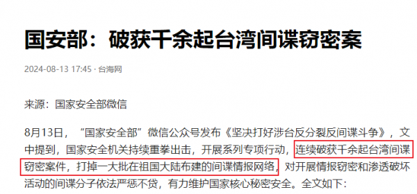 8月13日,"国家安全部"公众号上发布《坚决打好涉台反分裂反间谍斗争》,提到近期国安部破获上千起台湾间谍窃密案件,打掉了大批台当局在大陆的间谍网,有力维护了国家机密安全。从6月21日,最高法、最高检、公安部、国家安全部、司法部两高三部联合发布《关于依法惩治"台独"顽固分子分裂国家、煽动分裂国家犯罪的意见》(惩"独"22条意见书)开始,国家就一直在进行打独促统。