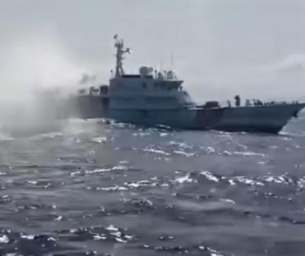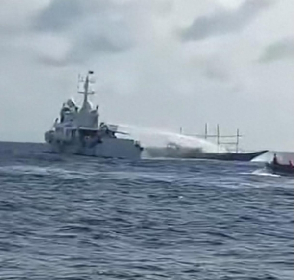 当天菲律宾的船只接近接近了我国线礁东南大约20多海里的蓬勃暗沙附近。我们的一线海警人员迅速对其进行喊话驱逐,而菲律宾船只显然是有备而来,面对喊话非但不理睬,甚至还加快了强行闯入的速度。在此情况下,我们的21562和21559两艘海警艇迅速出动,在近距离接近菲律宾船只之后,直接开启高压水炮进行强制驱逐。