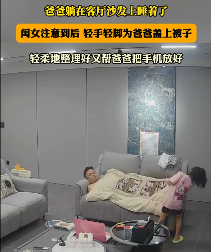 据视频显示,爸爸躺在客厅沙发上睡着了,闺女注意到后轻手轻脚的拿起被子为爸爸盖上被子,随后又轻柔地整理好又帮爸爸把手机放好。