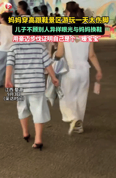 男孩大概十来岁,注意到妈妈走路不对劲,主动提出换鞋,妈妈一开始不同意,怕孩子穿高跟鞋难受,但男孩坚持最后两人换了鞋。