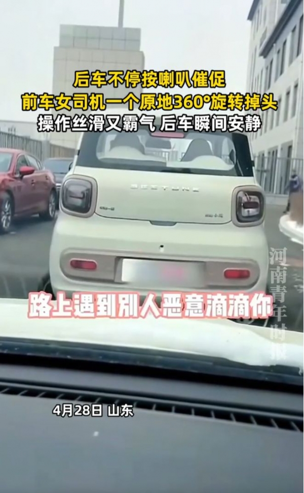 山东一女子在小区开车出门,后车不停地按喇叭催促,终于一次女子忍无可忍,直接一个原地360°旋转掉头,然后狠狠地看了一眼后车,闪了一下灯,后车瞬间安静!