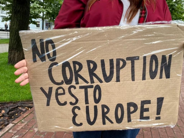 有抗议者举的标语是"拒绝腐败,拥抱欧洲"。