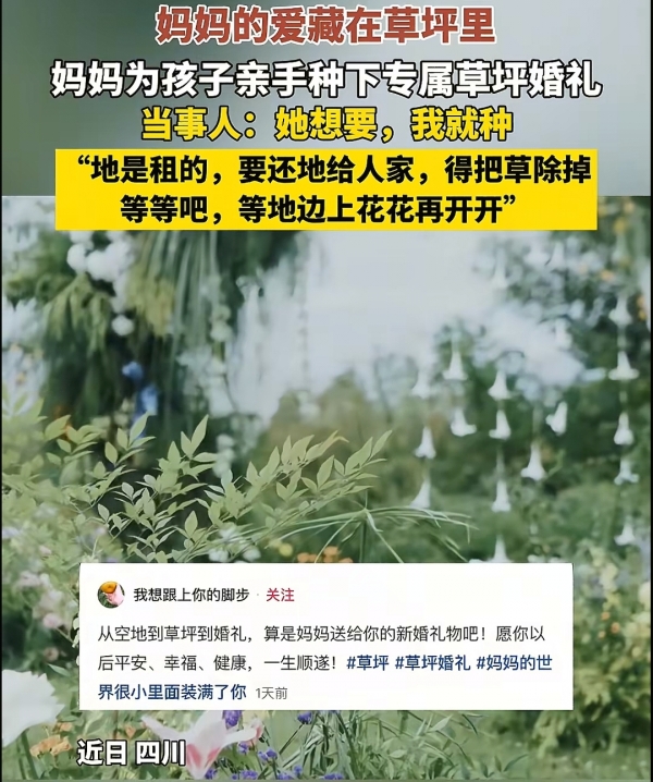 婚礼圆满结束,看着这片自己亲手培育的草坪,妈妈心里满是不舍。这片草坪承载了她对女儿的爱,从播种时的期待,到除草时的耐心,再到看到草坪逐渐成型时的喜悦,每一个环节都历历在目。但她深知土地是租来的,终究要还给人家。她没有立刻就把草除掉,而是打算等草坪边上的花再开一次。在等待花开的日子里,她常常会来到草坪边,看看草的生长情况,回忆婚礼当天的美好画面。她盘算着,等花开过,就找合适的工具,一点一点地把草清理掉,尽量不破坏土地原本的面貌,就像她小心翼翼地守护女儿的梦想一样,也认真地对待这片承载了爱的草坪的收尾工作。
