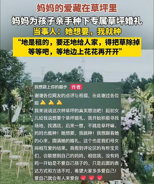 有人认为这位妈妈的行为是伟大母爱的体现,她用实际行动满足了女儿的愿望,这种用心的付出是金钱无法衡量的;但也有人提出疑问,为了一场婚礼花费时间和精力去种草坪,是否有些小题大做,而且租地种草后续还要处理,是否存在资源浪费的情况。然而无论如何,这份母亲对女儿的爱,通过这片草坪真实地传递了出来,它或许形式上有争议,但情感的真挚是毋庸置疑的。