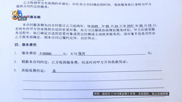 刘经理告诉记者,邱女士实际上见了4位男士,都没有进一步的发展。5月24号,双方签了第二份合同,匹配对象不限人数,期限2年,服务费用50000元。