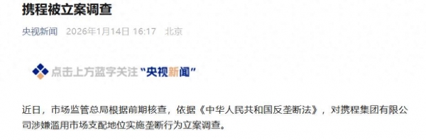 刚才看到个大新闻,就在2026年1月14日,市场监管总局正式发布公告,对携程集团立案调查了。罪名挺重,叫"涉嫌滥用市场支配地位实施垄断行为"。