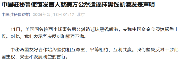据中国驻秘鲁使馆微信公众号2月13日消息,中国驻秘鲁使馆发言人就美方公然造谣抹黑钱凯港发表声明: