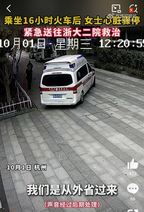 一名51岁女性从西安乘坐16小时动车前往杭州旅游,下车前在洗手间突发呼吸不畅、腹痛,随后心脏骤停倒地。被送往浙大二院抢救。患者女儿说:"我母亲是起来运动的时候,突然呼吸不畅,慢慢地就不可控制了。"