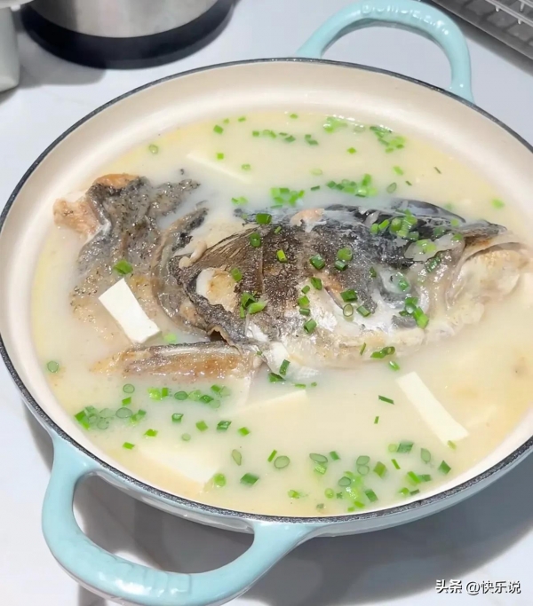 热锅冷油下姜片,鱼头煎至两面焦黄,加入开水煮至汤奶白