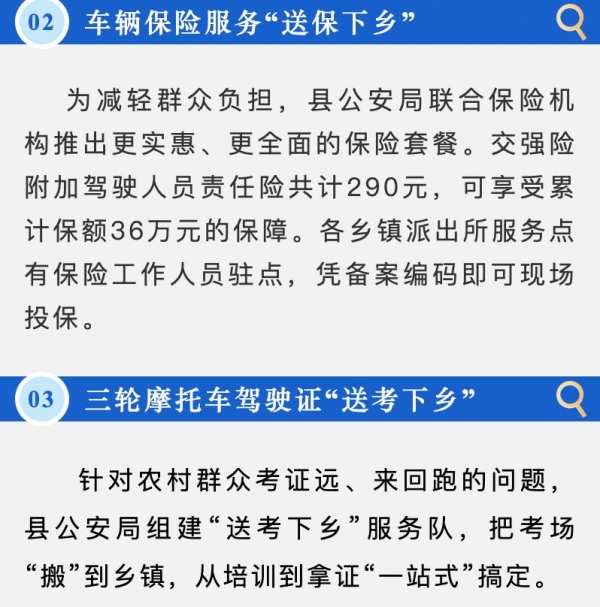 同时,当地为减轻车主出行负担,交管部门还联合保险机构推出交强险+驾驶人员责任险共计290元的保险套餐,各乡镇派出所服务点均可办理投保;针对距县交管大队路程超过15公里的乡镇常住居民,还可以在乡镇派出所服务点登记报名"送考下乡",服务点报名人数超过10人,交管部门就将立即安排考试。
