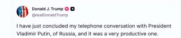 在16日稍晚时,美国总统特朗普在其个人社交媒体平台上发布了同俄罗斯总统普京当天通话的内容,并积极表态称,此次通话非常富有成效。在特朗普相关声明发出后不久,俄罗斯总统特使德米特里耶夫也发声表示,两国总统的通话"积极且富有成效",双方明确了下一步的行动方案。