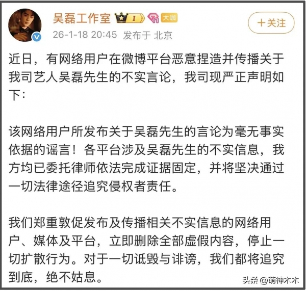 吴磊这边辟谣速度着实让不少粉丝群体羡慕,但辟谣话术太笼统,也没有直接点名侵权人,毕竟网友都是见过世面的,认为只要不告爆料源头就可信度大打折扣。而爆料人并没有点名就是演员吴磊,在他没有回应前,吴磊同名的CV解说等都在猜测范围内。