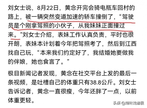 黄念表姐说,当时那辆轿车正在加速变道,这才撞上了妹妹,而且是正面相撞的,对方是刚刚驾照的驾驶员。