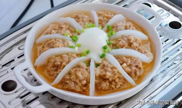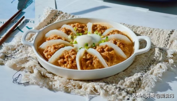 3、萝卜中间包入馅料,摆入盘中放好。中间空出的部分打个鸡蛋进去,上锅蒸二十分钟即可。