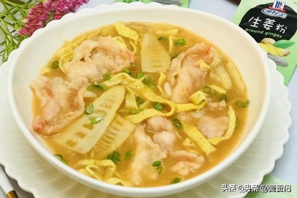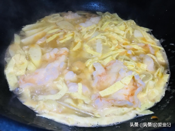 4、起锅放油,先把鸡蛋在里边炒好盛出来。虾头倒进去,把香味煸出后淋入开水,这时候把笋,虾仁放进去,变色断生后,放入鸡蛋,补充一点生抽,食盐,味道适宜后关火。