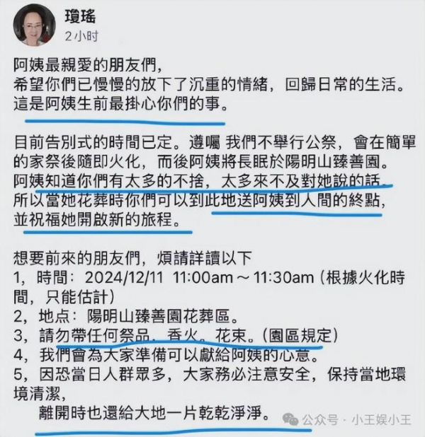 但陈中维并没有低调处理,而是站在粉丝的角度,发布了一条消息,他告知了大家下葬的具体时间,并且善解人意的表示,如果有粉丝不舍,或者有想要和她说的话,那么可以来为她送上祝福。