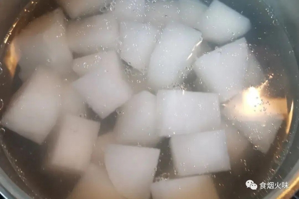 接下来把小葱洗净,洗净之后的小葱头尾去掉,然后切成小段,切好后的放一旁。准备一个锅,锅里面放入水,然后把白萝卜捞出来放入锅中焯水个两分钟。