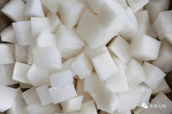 备好的白萝卜洗干净,清洗一下。把白萝卜洗净之后,用刀去掉它的头尾。然后用削皮刀把它的外皮去掉,白萝卜的外皮都比较老,所以要给它处理一下。处理好的白萝卜切成小丁,状好后放在盆里面。加入适量的食盐,搅拌一下,腌个10来分钟,有一定的去水,杀菌作用。