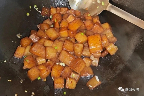 把锅里面的白萝卜煮好后开锅,加入小葱点缀一下,用铲子把食材炒均匀之后,这样一份美味的红烧白萝卜就完成。虽然没有加什么其他的辅料,但是这样子简单炒出来的萝卜比肉还香鲜,咬下去汁水饱满,非常的清甜,特别好吃。