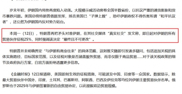 特朗普打响第一枪,25%关税立即生效,不许中伊做生意,想来硬的