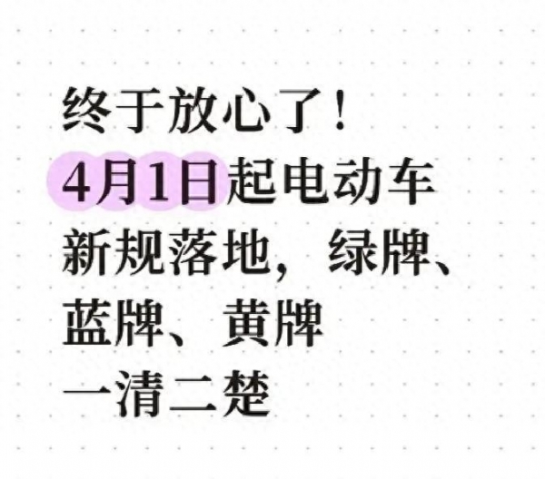 过去同一车型在不同城市规则不同(有的能上牌、有的不能),4月1日后全国统一分类标准,不管在哪个城市,绿牌、蓝牌、黄牌的认定规则一致,执法透明,车主不用再担心跨城出行被罚。