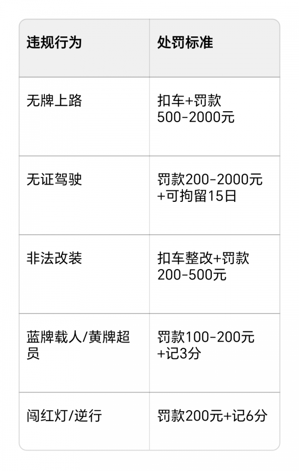 3. 非法改装:拆除限速装置、加装大功率电池、改装电机、加装雨棚/伞具,一律扣车整改,并处罚款 ;