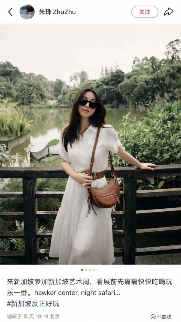 她是受官方邀请,去参加新加坡艺术周开幕的。除了在活动上分享看展体验,更多时间是和家人一起悠闲地逛吃逛玩。朱珠自己也在社交媒体上发了 旅行照片,配文说"痛快吃喝玩乐"。