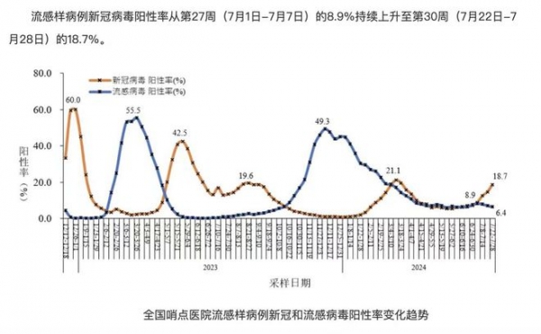 在我国,中国疾病预防控制中心公布的7月份全国新型冠状病毒感染疫情情况显示,流感样病例新冠病毒阳性率从第27周(7月1日-7月7日)的8.9%持续上升至第30周(7月22日-7月28日)的18.7%,也就是说,新冠病毒感染呈现上升的趋势。