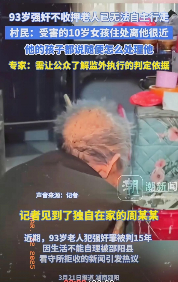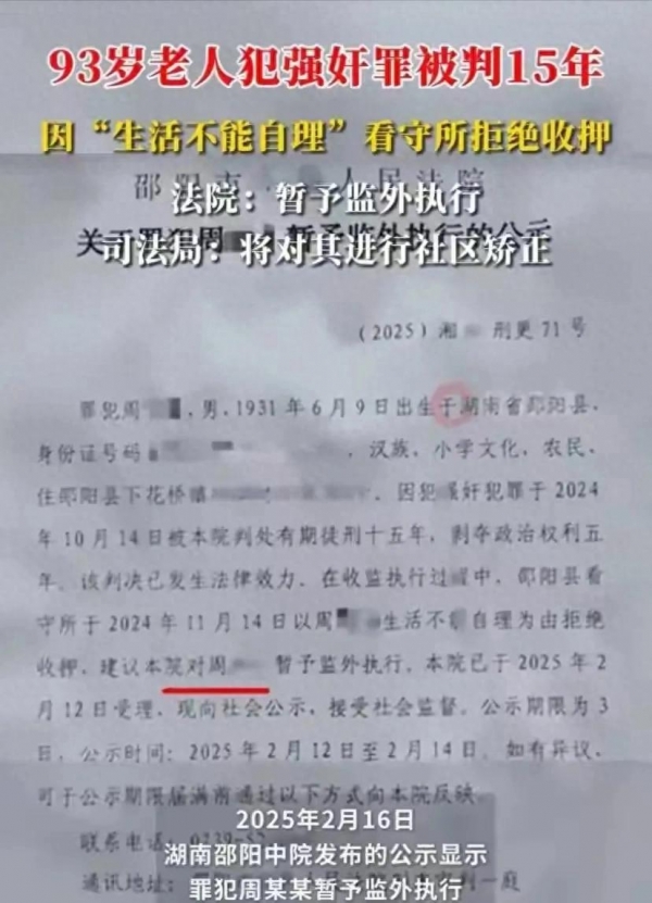 2025年2月16日,湖南邵阳中院发布的公示显示罪犯周某某新予监外执行,93岁的周某某是因为犯强奸罪被判有期徒刑15年。