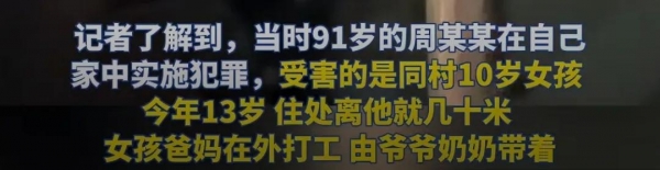根据当地村民透露的内幕显示,受害的十岁女孩当时离老人住的地方很近,就几十米的距离,再说那也是三年前的事情了,那个时候的周某某才91岁。