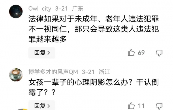 一位来自广东的网友在评论区吐槽,法律如果对于未成年人,老年人违法犯罪不能一视同仁,就会导致这些未成年人和老年人犯法的事情越来越多。