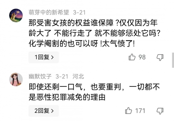 有网友表示,这位93岁的罪犯因为失去生活能力就不用坐牢了,那十岁的受害的孩子的权益由谁来保护呢?