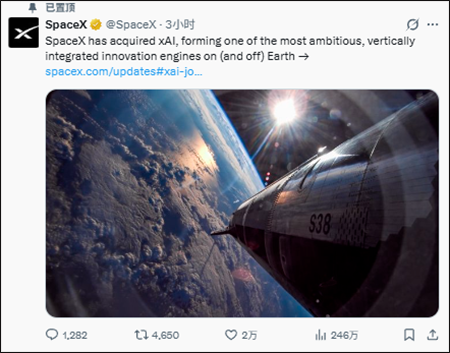 SpaceX网站发布的声明显示,该公司此次收购旨在实现人工智能、火箭技术、星基互联网、移动终端直连通信,以及全球领先实时信息与言论自由平台的深度融合。合并后的公司将构建起"地球内外野心最宏大、垂直整合程度最高的创新引擎",并致力于通过规模化扩张打造"感知的太阳"以探索宇宙。
