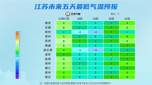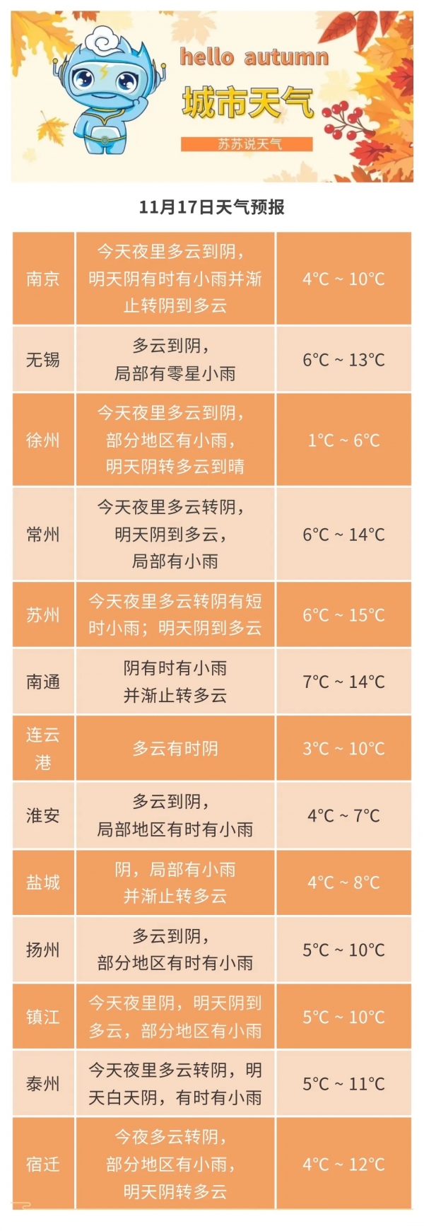 11月17日08时至11月18日08时,淮河以南地区阴有时有小雨并渐止转阴到多云,其他地区阴转多云。今天最高温度:本省东南部地区14℃左右,淮北地区5~6℃,其他地区9℃左右;明晨最低温度:沿淮和淮北地区-2~-1℃,苏南南部地区2~3℃,其他地区0℃左右,全省大部分地区有霜或霜冻。全省西北风5-6级阵风7级逐渐减弱至4-5级。