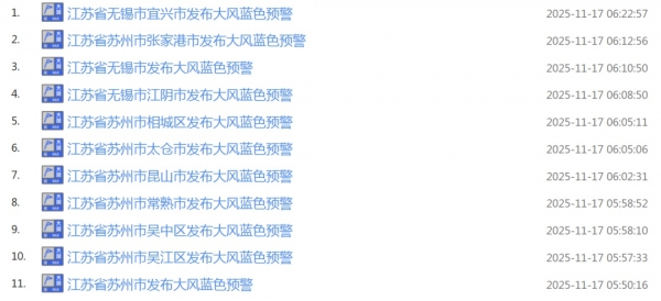17日早晨,江苏苏州市、无锡市气象台也发布大风蓝色预警: