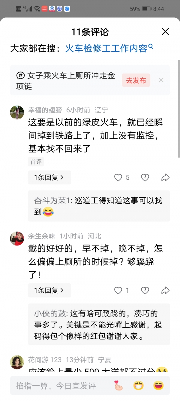 这起暖心的春运小事在网上传开后,网友们纷纷为铁路工作人员点赞,分享着自己的看法。网友@春运回家路 说:"太暖心了!这串项链不只是金子,更是结婚纪念,铁路工作人员太负责了!"网友@坐火车的小美好 表示:"换做别的地方可能就说找不回了,他们还特意耗时费力帮忙,强忍异味掏管道,太不容易了!"网友@生活中的小幸运 留言:"春运本来就忙,还愿意为了乘客的一件私人物品这么用心,这波必须给铁路人点个大大的赞!"还有网友@旅途那些事 感慨:"出门在外丢东西真的太闹心了,遇到这么负责的工作人员,包女士也太幸运了吧!"