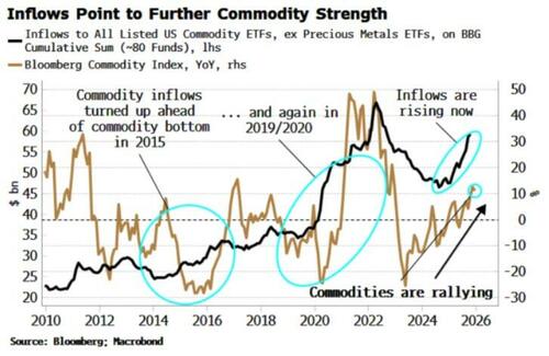 去年,大宗商品即将复苏的迹象其实已十分明显。流入该板块的资金大幅增加,这在过去十年的前两次显著上涨(2016/17年和 2020/21年)之前也曾出现过。这不仅是黄金现象。下图显示了流入大宗商品ETF(作为整体资金流的替代指标)的资金,这还不包括贵金属基金。